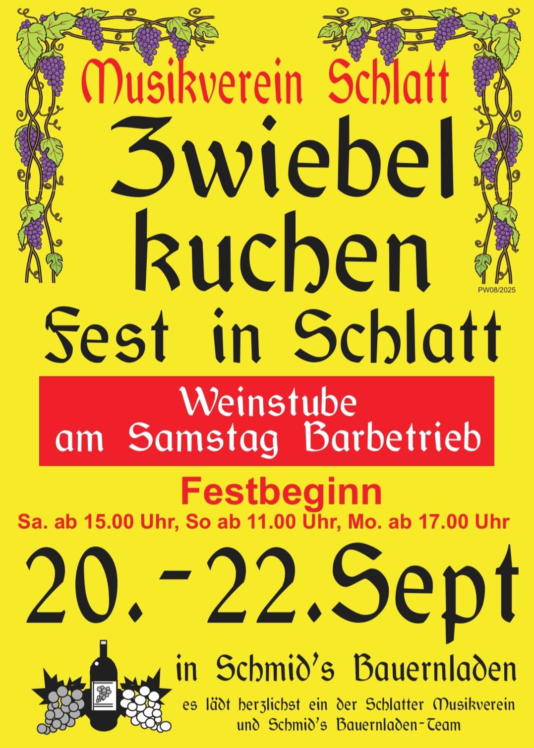 Das Fest im historischen Lehenshof von Schmids Bauernladen in der Lazariterstr. 25 in Schlatt beginnt am Samstagabend mit Benne und seiner beliebten Tanzmusik. Am Sonntag spielen die Trachtenkapelle Steinenstadt, die JuKa Schlatt-Biengen-Hausen und unsere Erwachsenen-Combo, abends sorgt die Schütz Dich Liesel Combo aus Ebringen für gute Stimmung. Für die Gäste gibt es neuen Schlatter Wein, hausgemachten Zwiebelkuchen sowie weitere kulinarische Köstlichkeiten, einen Weinbrunnen sowie am Samstag Barbetrieb. Das traditionelle Haxen-Essen am Montagabend wird vom Senioren-Blasorchester des Markgräfler Musikverbands begleitet.